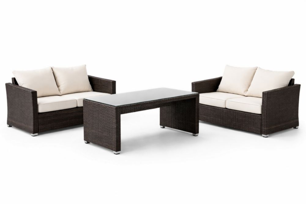 Ensemble de mobilier de jardin en résine tressée avec coussins crème et table en verre